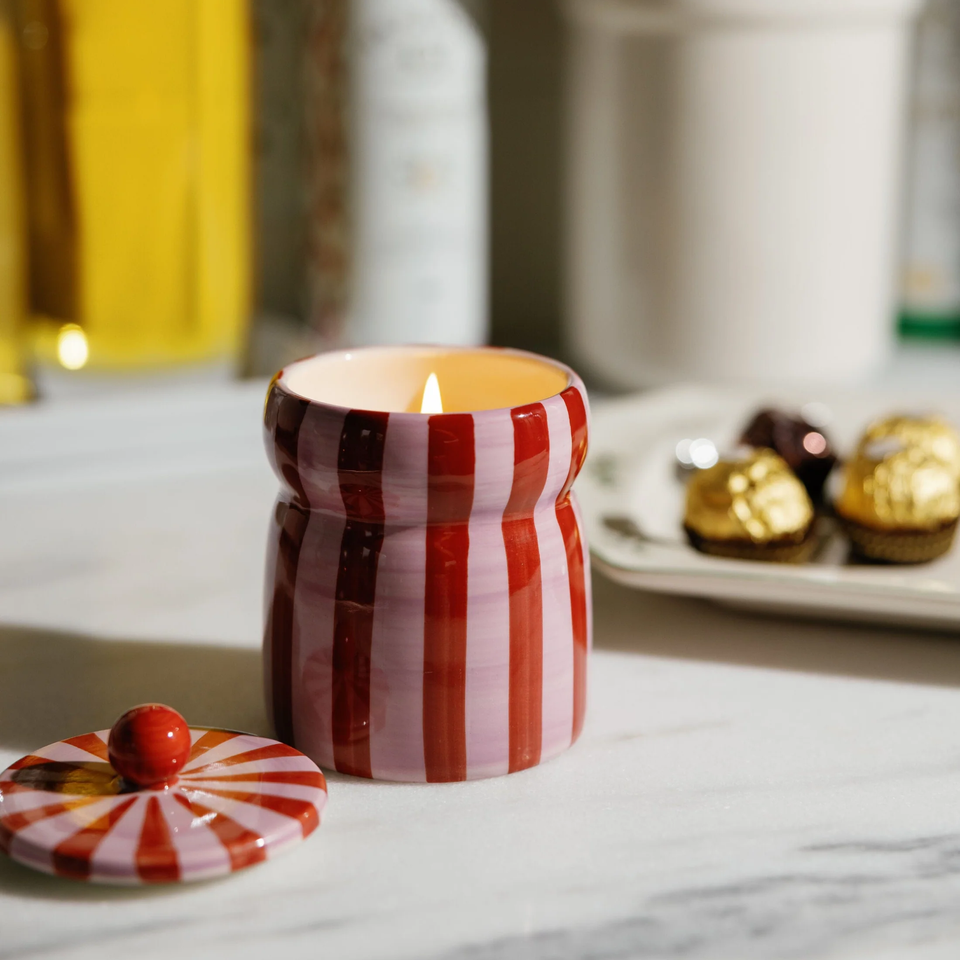 Lumineuse et joyeuse, la bougie en céramique Menthe poivrée rose de Paddywax apporte une touche de fantaisie aux fêtes de fin d'année.