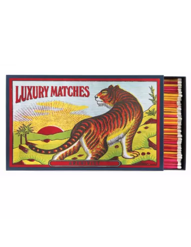 La marque Archivist présente de grandes allumettes présentent un tigre majestueux, perché au sommet d’une colline, observant le lever du soleil à l’horizon.