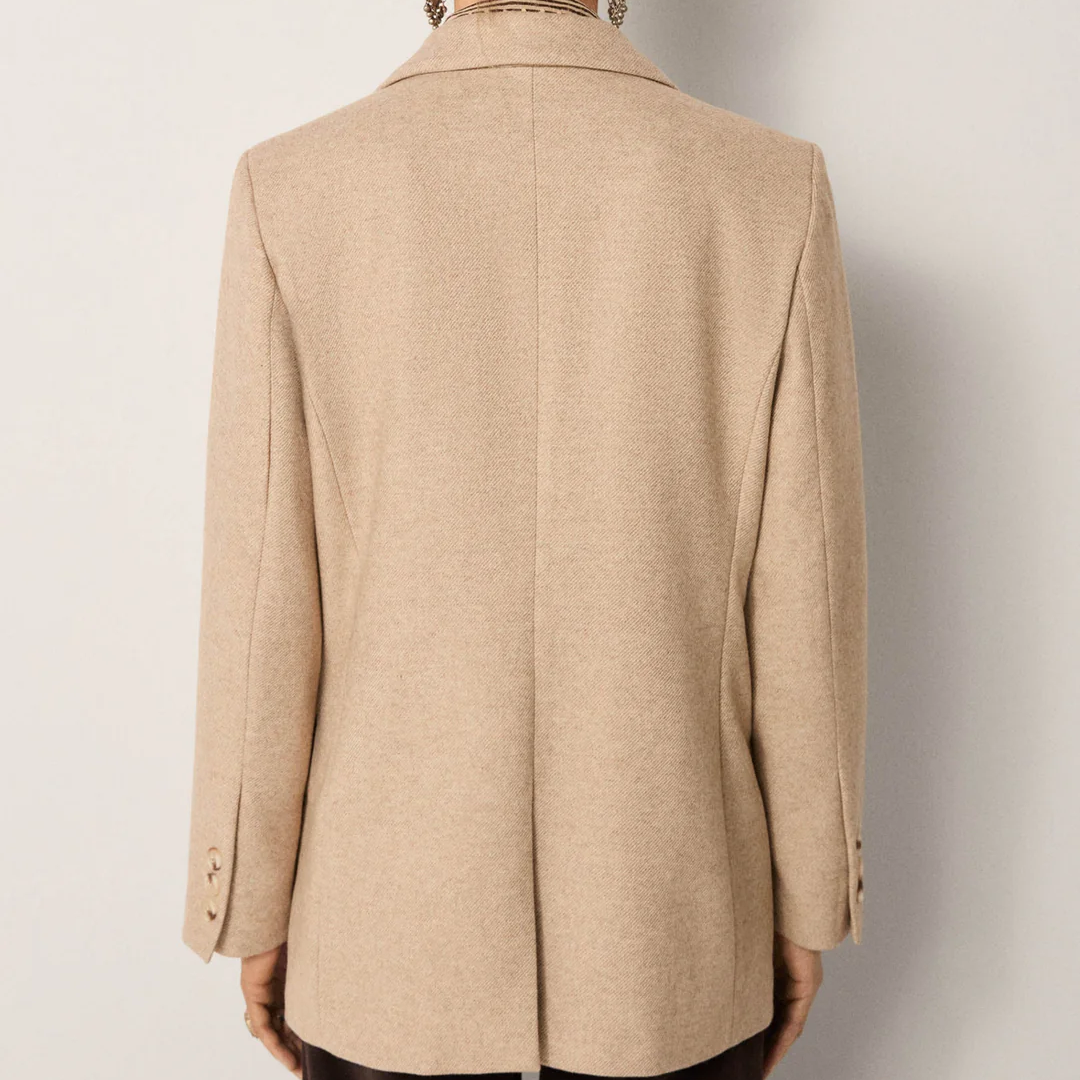 Le ton beige est à la fois sobre et raffiné, avec des revers nets et une coupe précise. La texture reste douce, créant un équilibre parfait entre structure et confort.