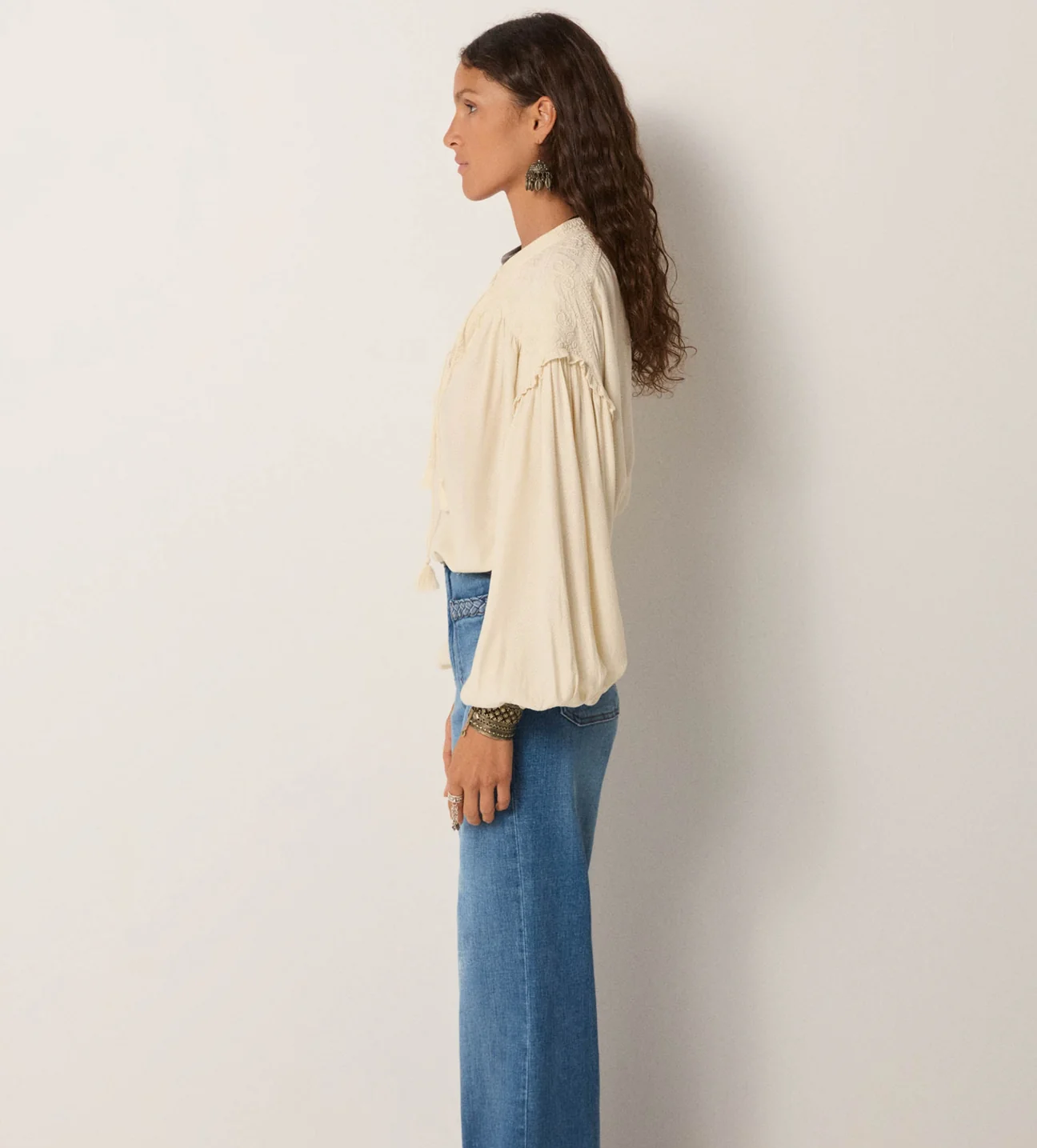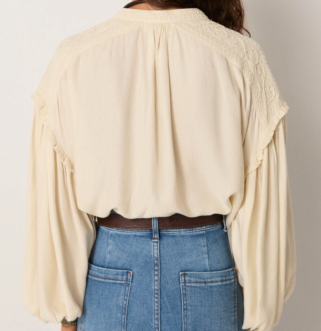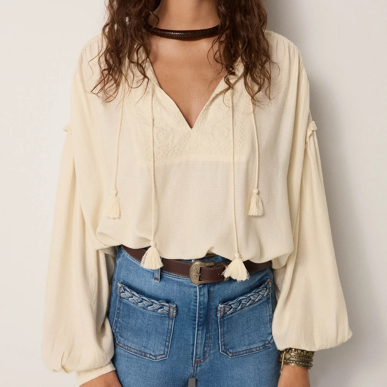 Un jacquard de viscose à motif losanges confère à ce chemisier une texture subtile et profonde. Sa douce teinte ivoire lui confère un caractère intemporel et polyvalent.