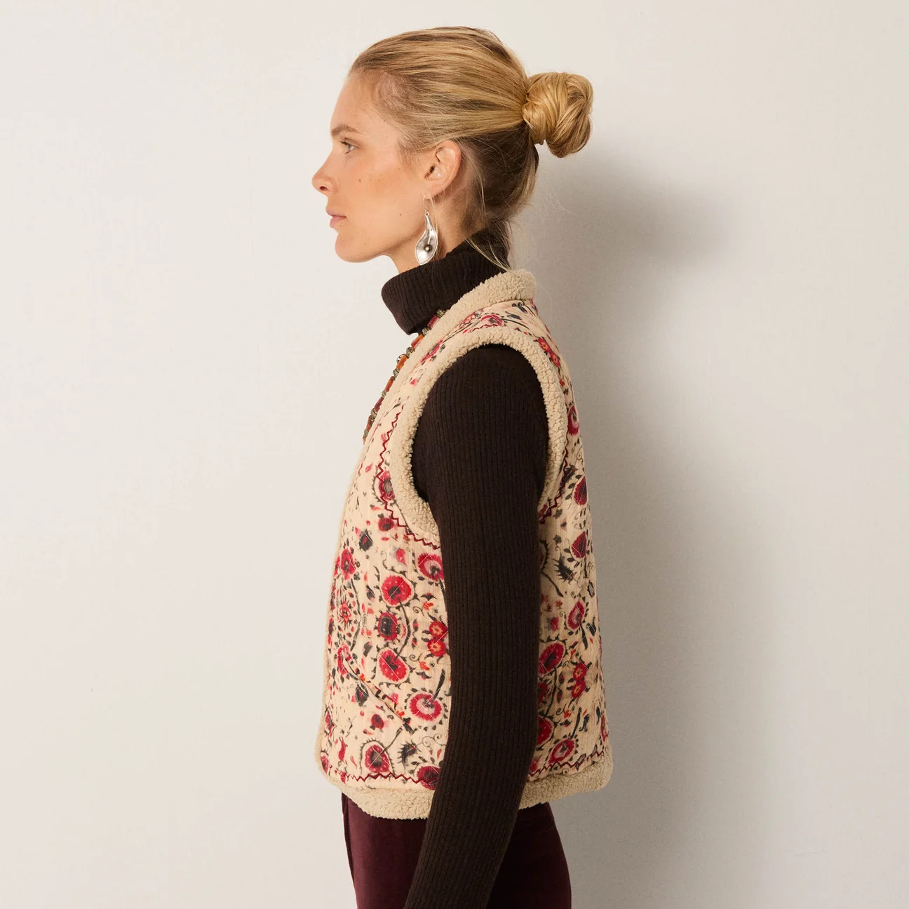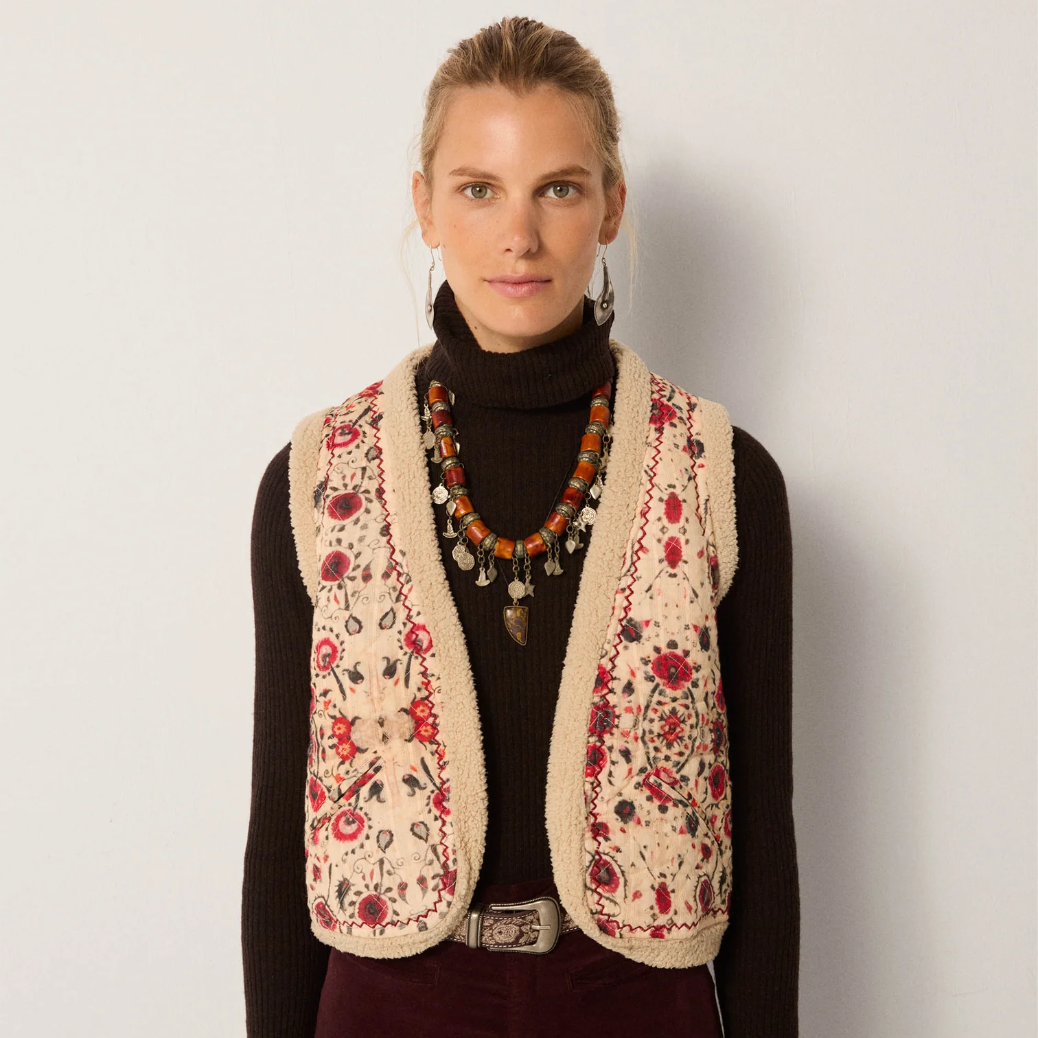 Doublure en coton matelassé, ornée de rouges fleuris et de motifs terreux sur fond clair, doublée de peau lainée douce pour plus de chaleur. L'imprimé évoque un esprit vintage et folklorique, une tapisserie adoucie par le temps.