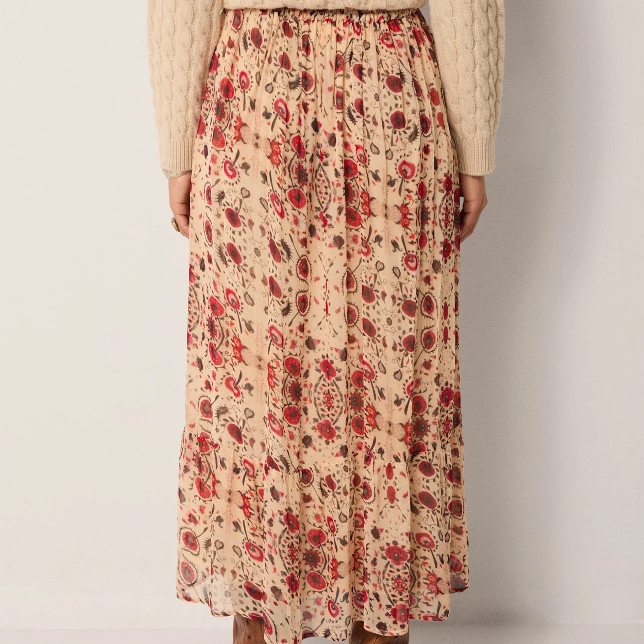 Crêpe de viscose, doux et fluide, imprimé de fleurs éparses à l'esprit presque folklorique : des fleurs rouges et des motifs terreux se détachent sur un fond lavé à la craie. Un tissu qui bouge comme un souvenir, changeant au gré de la lumière.
