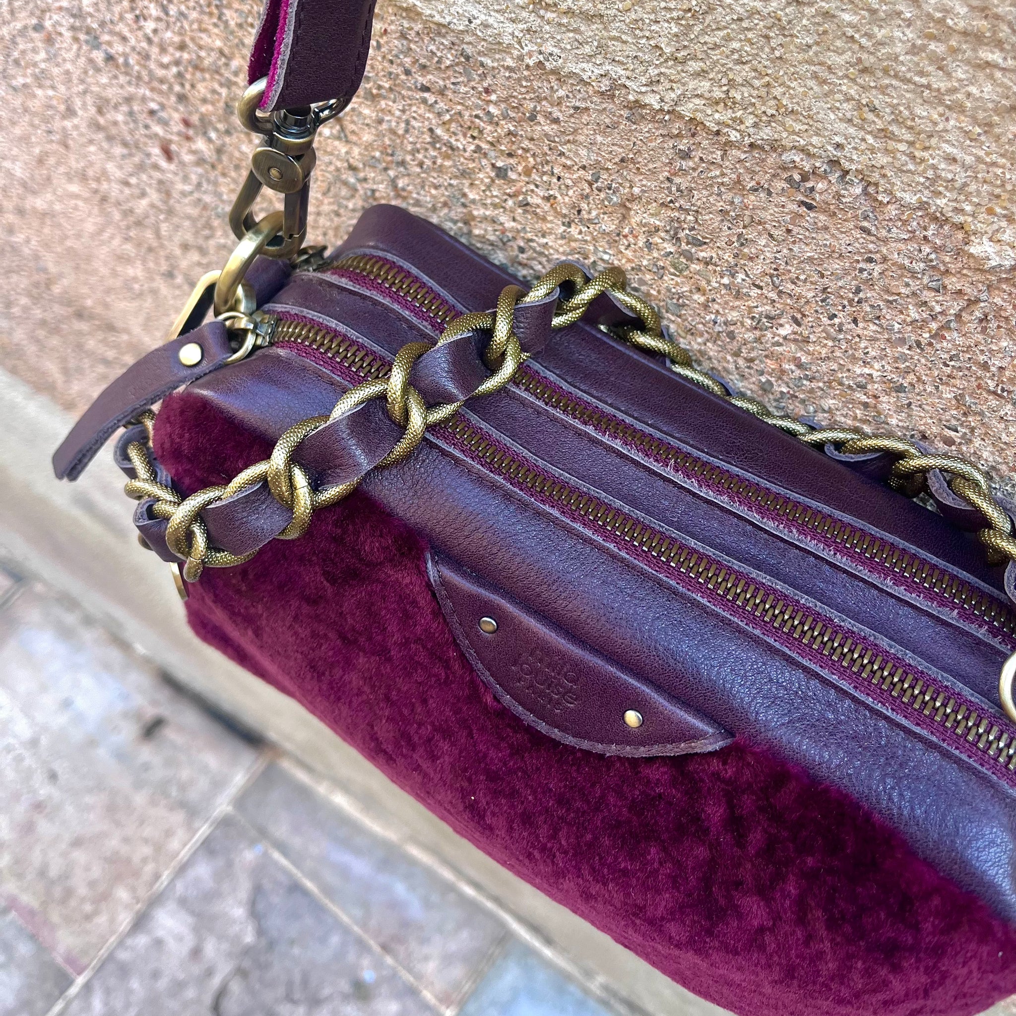 Sac bandoulière Mila Louise moumoute bordeaux et en cuir de vachette lisse.