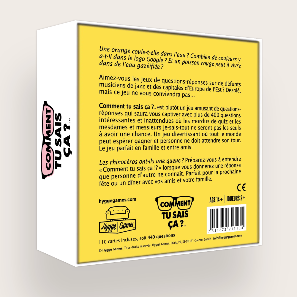 Comment tu sais ça ? est plutôt un jeu amusant de questions-réponses qui saura vous captiver avec plus de 400 questions intéressantes et inattendues où les mordus de quiz et les mesdames et messieurs je-sais-tout ne seront pas les seuls à avoir une chance. Un jeu divertissant où tout le monde peut espérer gagner et personne ne doit attendre son tour. Le jeu parfait en famille et entre amis !