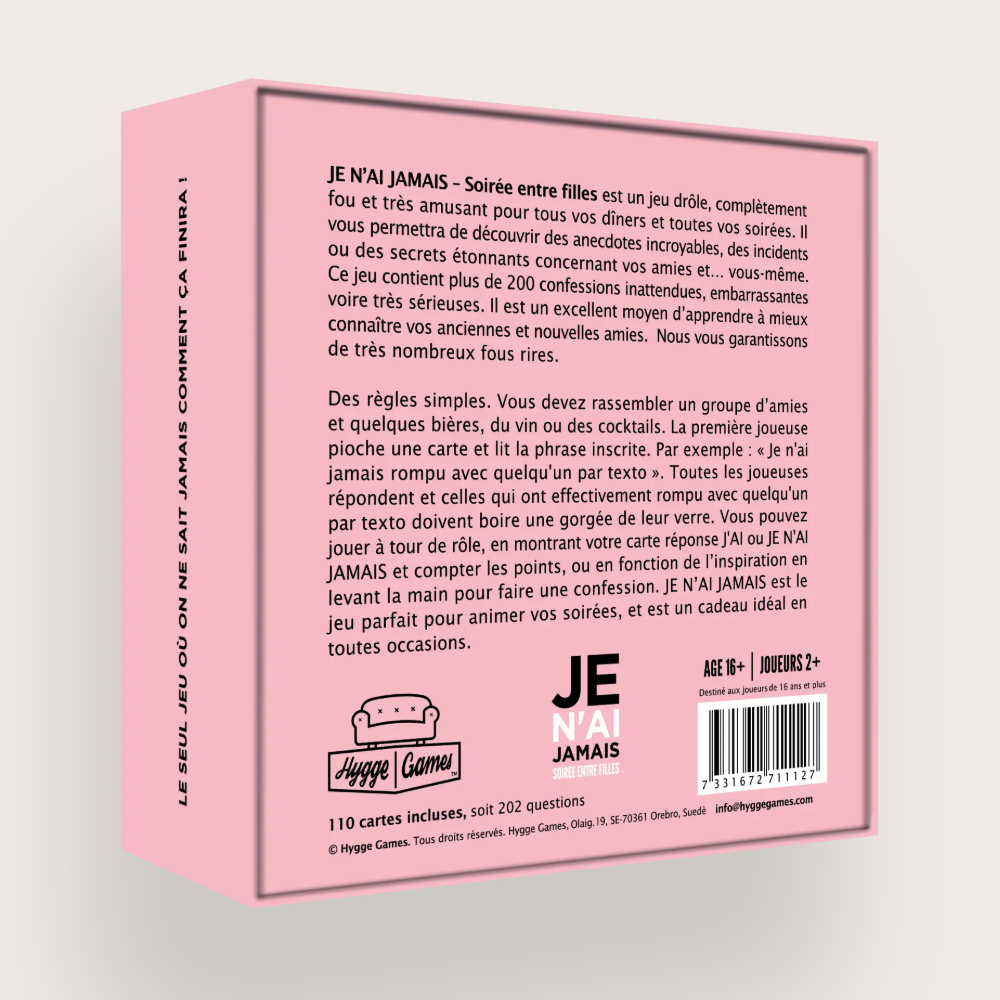 Je n’ai jamais - Soirée entre filles est un jeu drôle, complètement fou et très amusant pour tous vos diners et toutes vos soirées. Il vous permettra de découvrir des anecdotes incroyables, des incidents ou des secrets étonnants concernant vos amies et... vous-même.
